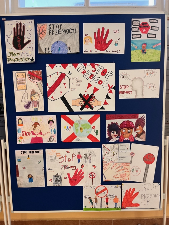 • Konkurs plastyczny na plakat promujący przeciwdziałanie przemocy rówieśniczej cieszył się dużym zainteresowaniem. W klasach I–III konkurs miał charakter międzyklasowy i odbył się przy współudziale wychowawców. Uczniowie starszych klas przygotowywali swoje prace indywidualnie pod kierunkiem pani mgr Małgorzaty Tatoń.